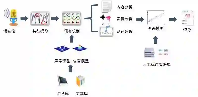口语测评一般包括两个环节,首先通过语音识别对用户的录音进行分析,提取一些声学和韵律等各方面的特征,然后再通过训练好的测评模型估计用户的评分。