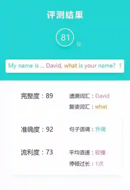 “我们既提供整个句子或者是篇章的总体打分,同时也提供包括完整度、流利度、准确度在内的每个维度的分数。我们还会反馈小到音素级别的音素发音分、音素检错信息,单词发音分、单词重音检错,句子语调、语速、停顿、重复、遗留单词等信息。”