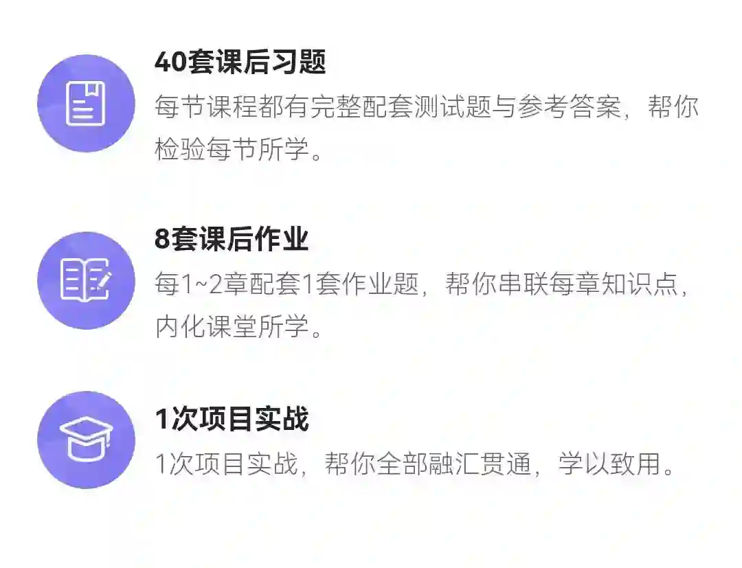课程配套完整的试卷&作业&实战项目,帮你彻底掌握所学知识,同时增加项目经验,打造求职作品集。所有作业均由导师亲自批改,实战也将由导师亲自指导!