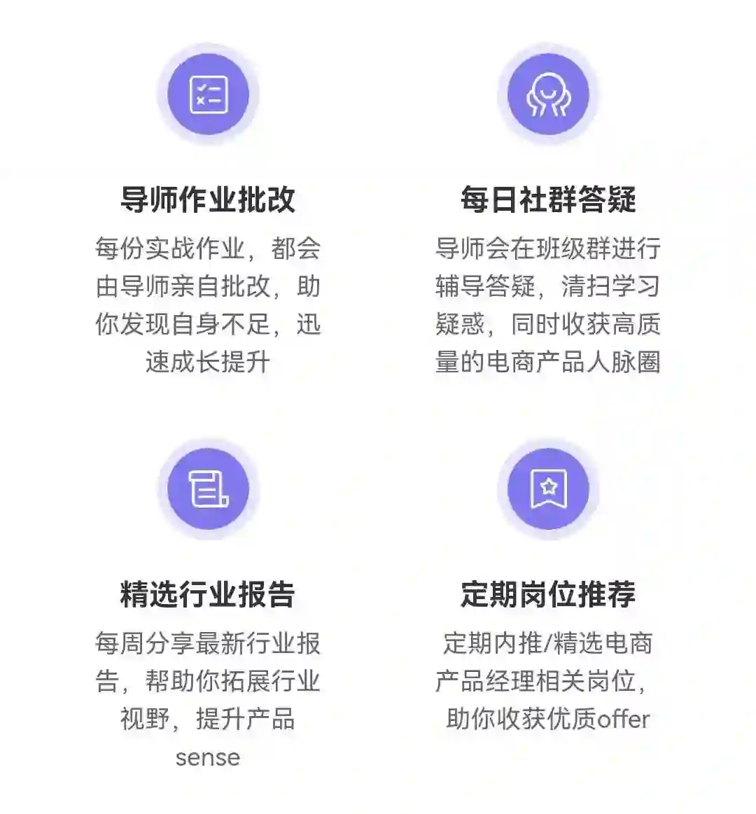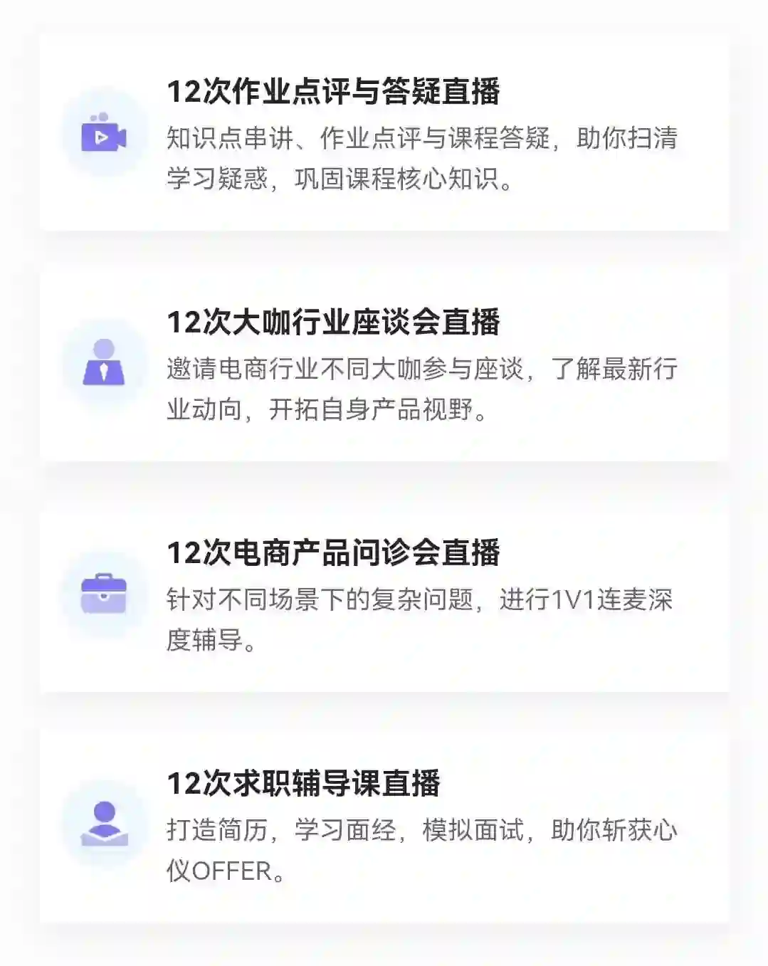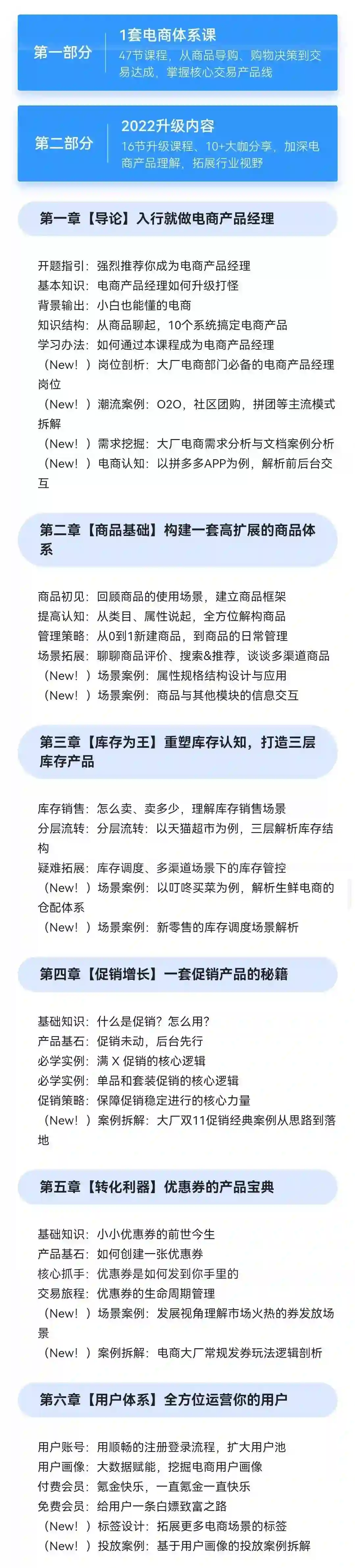 课程将从实战出发,通过 1 套电商体系课、48 场专项直播,8 次实操作业、1 个实战项目,365 天导师伴学,帮助 0-3 岁电商产品经理,系统掌握大厂规范的电商产品核心能力,成为有思考、有策略的高薪电商产品经理。