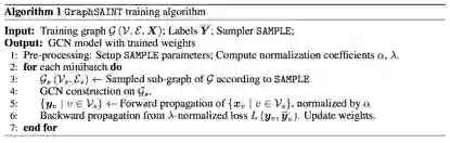 GraphSAINT 的算法流程如下图所示。其中,变量SAMPLE主要有两点要求。(1)相互影响较大的节点应在同一子图中采样。(2)每条边的采样概率均不可忽略。对于要求(1),理想的SAMPLE要求衡量节点连接的联合信息以及属性。但这种算法可能具有很高的复杂度,所以,为简单起见,我们从图连接性角度定义“影响力”,并设计基于拓扑的采样器。要求(2)可使神经网络能够探索整个特征和标签空间。