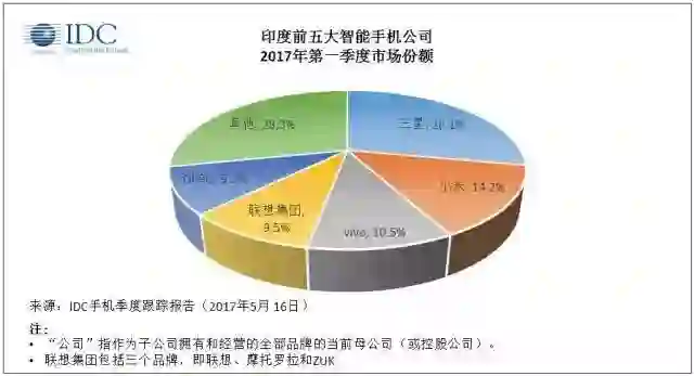 根据IDC 2017年一季度的数据,印度前四大手机品牌分别是三星、小米、vivo、OPPO和联想。其中,四家中国手机品牌在印度的市场份额总和达43.5%。