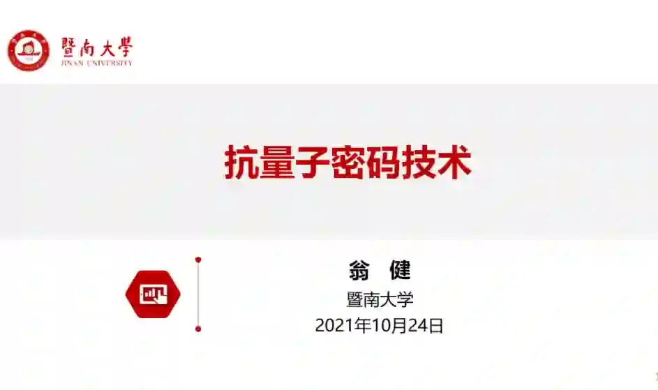 接下来,暨南大学副校长翁健教授在线作了题为“抗量子计算密码技术”的分享。翁健教授首先介绍了量子计算机对公钥密码学和对称密码学的安全性影响,以及当前密码学界在研究的可以抵抗量子计算机攻击的几种主流密码技术,侧重介绍基于格的密码技术的研究进展。他还分享了抗量子密码技术的标准制定情况,并对抗量子计算密码技术的前景进行展望。