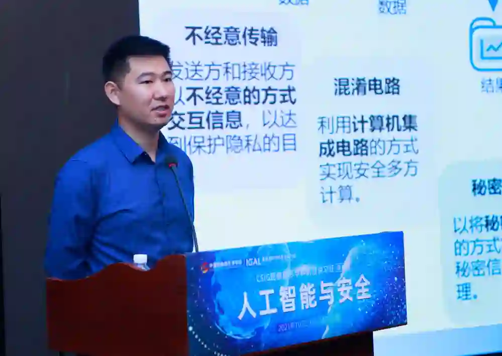 接着,中国科学院信息工程研究所信息安全国家重点实验室副主任陈恺研究员围绕“人工智能安全前沿进展”的主题作了分享。陈恺研究员从人工智能安全对抗展开,介绍了人工智能对抗攻击、数据中毒、模型后门、模型窃取等攻击手段并探讨针对该类攻击的防御措施,并详细讲述了模型的知识产权保护手段、数据遗忘等隐私相关问题。
