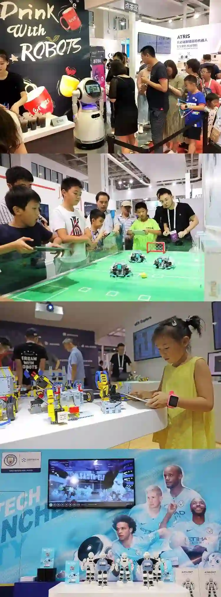 其中,悟空机器人带来了抖音挑战赛,吸引了现场小朋友、舞蹈达人们踊跃参与,成为展会最火热的活动;Jimu Robot达人秀则展示了全国各地的达人们利用Jimu套件拼搭的创意作品,小朋友们在现场体验Jimu Robot的足球车比赛,通过编程让Jimu Robot足球车踢球、进球,玩得不亦乐乎;机智的Cruzr(克鲁泽)担任智慧店长,为现场观众们准备暖心奶茶,吸引了观众排长队体验,成为展会的“新零售网红奶茶店”;智能巡检机器人ATRIS也大展身手,在现场演示了爬楼梯和主动人脸识别技术,观众们纷纷体验,感受城市安全守护者的强大;优必选的人工智能机器人教育解决方案也是首次重大亮相,直接把妙趣横生的机器人课堂搬到了展会现场,让观众体验人工智能机器人课程;曼城足球俱乐部机器人代言人Alpha Ebot则身着曼城球衣向大家问好,向大家展示他灵活的运动能力。