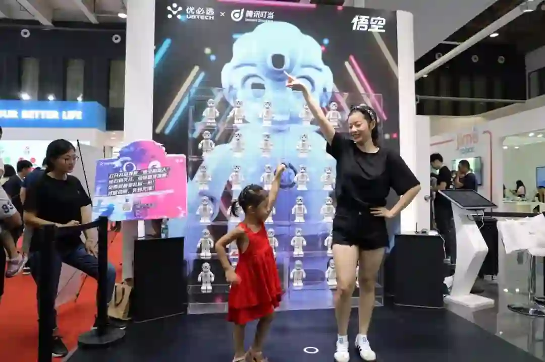 (优必选便携式智能机器人悟空在展会现场与观众互动)