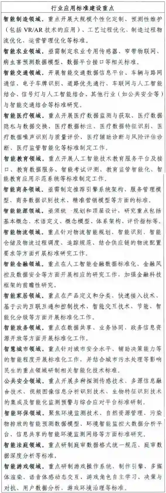 到2023年,初步建立人工智能标准体系,重点研制数据、算法、系统、服务等重点急需标准,并率先在制造、交通、金融、安防、家居、养老、环保、教育、医疗健康、司法等重点行业和领域进行推进。建设人工智能标准试验验证平台,提供公共服务能力。