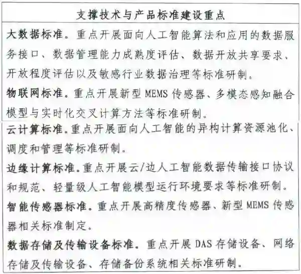 1.大数据标准。规范人工智能研发及应用等过程涉及到的数据存储、处理、分析等大数据相关支撑技术要素,包括大数据系统产品、数据共享开放、数据管理机制、数据治理等标。
