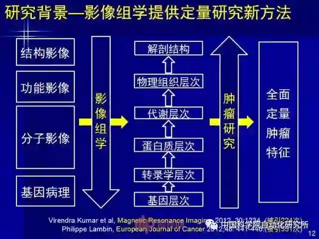 现在的影像技术是从宏观到微观,先有结构影像再到功能影像、分子影像,它的精标准正好是基因病理。而从基础研究来说,恰恰是从微端到宏观,当在基因组、蛋白组、代谢组都搞不定的时候,又回到生物医学,使用解剖结构。所以一个是从微观到宏观,另一个则是从宏观到微观,如果将二者结合到一起,就有可能进行肿瘤的诊疗。这也是整个影像组学的切入点。