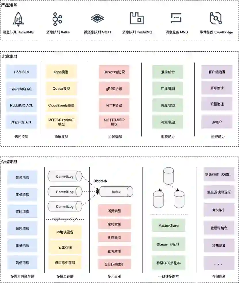 存储:基于分区的 WAL 存储,多类型索引(普通、定时、事务等),核心的收、发、查询能力,多副本复制能力等。