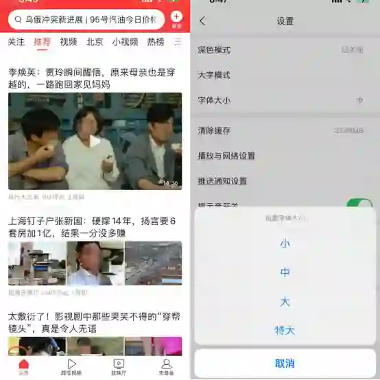 这一点我们可以向今日头条学习,今日头条产品设计本身非常很简洁。针对于一些老年人的特殊需求,它选择在设置增加调节字体大小的功能。