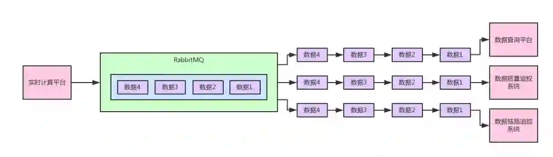 也就是说,我们想要实现的上图的效果:实时计算平台发布一系列的数据到消息中间件里,然后数据查询平台、数据质量监控系统、数据链路追踪系统,都会订阅数据,都会消费到同一份完整的数据,每个系统都可以根据自己的需要使用数据。