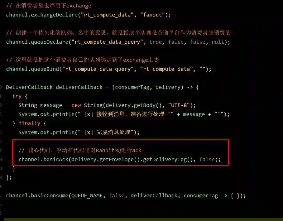 对消费者的代码也进行修改,之前我们在这里关闭了autoAck机制,然后每次都是自己手动ACK。
