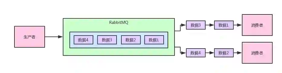 上图其实就是采用的RabbitMQ最基本的队列消费模型的支持,你可以理解为RabbitMQ内部有一个队列,生产者不断的发送数据到队列里,消息按照先后顺序进入队列中排队。