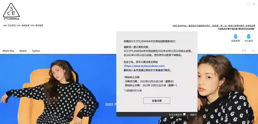 【昔日最火韩流品牌“扑街”,Stylenanda全面退出中国线上市场】韩国时尚品牌Stylenanda近日正式关闭天猫海外旗舰店。其中文官网发布停运声明称。Stylenanda客服表示,此次变动是渠道调整所致,消费者今后可以前往英文官网进行购买,但此前的会员等级和积分将会受到影响。在线下,消费者仍能在品牌直营店3CE STYLENANDA和潮流集合店i.t购买其产品。(界面新闻)