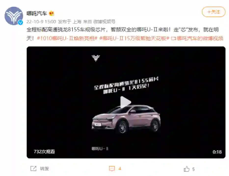【哪吒U-Ⅱ将于10月10日上市】哪吒汽车官方宣布,哪吒U-Ⅱ将于10月10日正式发布,全程标配高通骁龙8155车规级芯片,号称15万级智舱天花板。(IT之家)