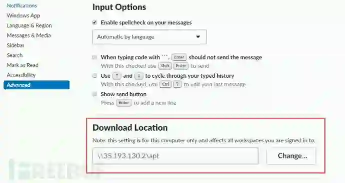 这样一来,当我把这个slack://settings+link发送给其它Slack用户后,一旦对方点击,其Slack应用程序中的文档下载存储位置就自动变为35.193.130.2\apt: