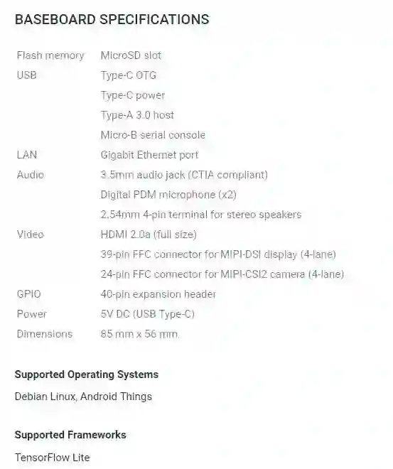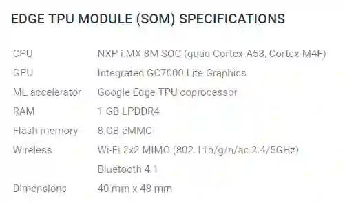 为了使 Edge TPU 能快速开始开发和测试,谷歌构建了一个开发套件。该套件包括一个系统模块(SOM),它结合了谷歌的 Edge TPU,NXP CPU,Wi-Fi,和 Microchip 的安全元件。该套件将于今年 10 月份面向开发者推出。