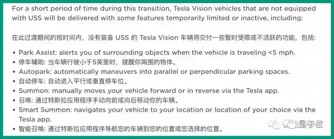 特斯拉这份公告还指出,移除超声波雷达后,升级为“Tesla Vision”系统的车辆将面临一段短暂的过渡期。