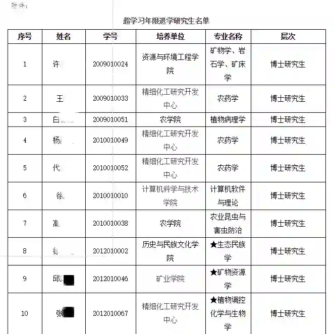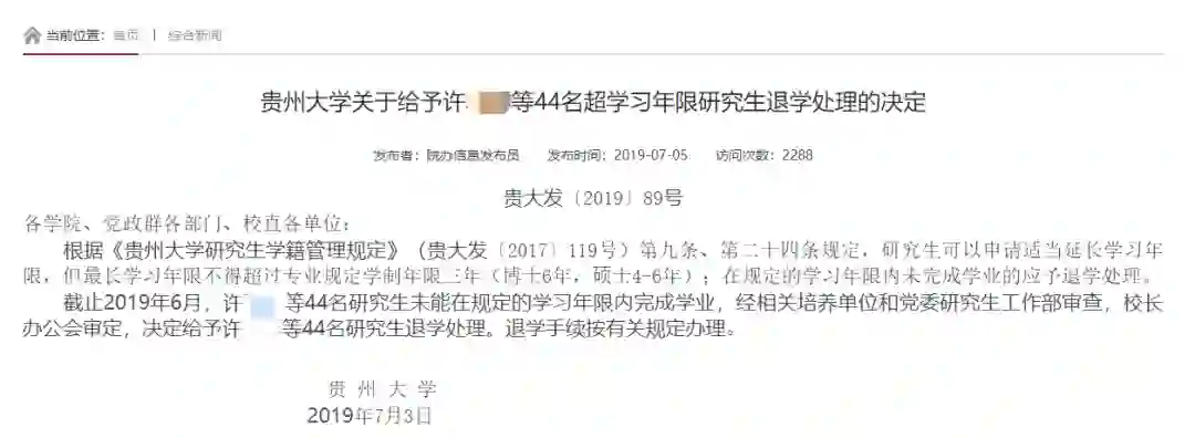 2019年7月5日,贵州大学研究生院官网发布了一则消息“贵州大学关于给予许某等44名超学习年限研究生退学处理的决定”。