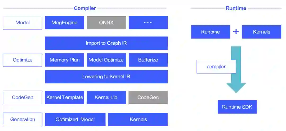 模型编译:编译 MegEngine 模型,生成运行这个模型对应的 Kernel 以及优化之后的模型。
