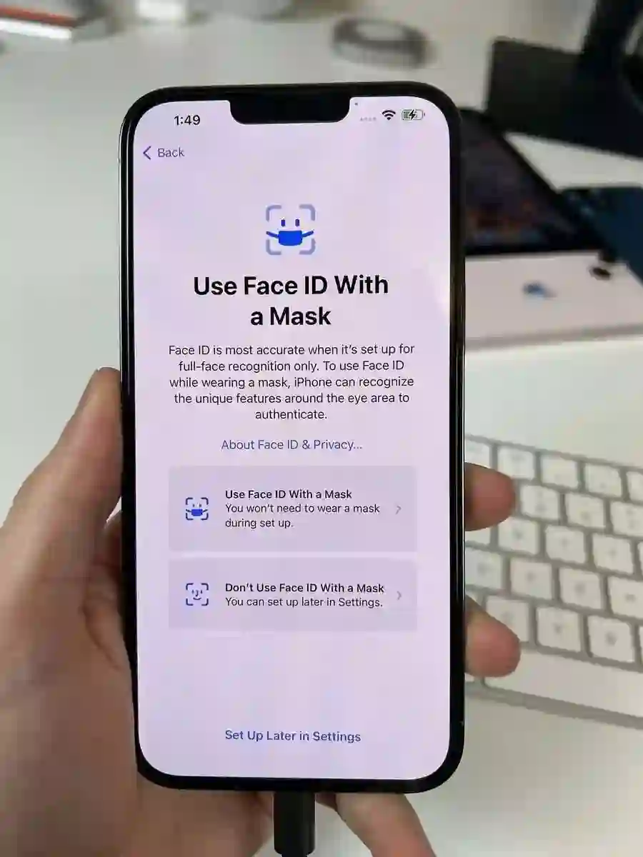 若用户平常戴眼镜,也有「添加眼镜」的选项,协助用户戴着眼镜和口罩时能更准确地解锁Face ID。用户可以稍后添加眼镜信息。苹果公司允许每台手机注册最多四副眼镜。现在还可以在戴着口罩时验证Apple Pay交易。