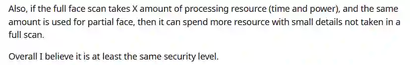 有关芯片的猜测,Reddit的果粉板块上,有人说得很有道理:「如果全脸扫描识别需要使用一定量的时间、算力等处理资源,然后处理部分脸部扫描识别的还是同等量资源的话,那么算法必定要在识别全脸扫描时忽略的小细节上投入更多算力。」