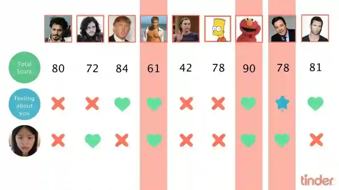 拿Tinder举例,他们有一款快淘汰了的约会评分体系Elo。Tinder靠右滑来表示喜欢某一用户,右滑的数量越多,表明喜欢该用户的人越多。