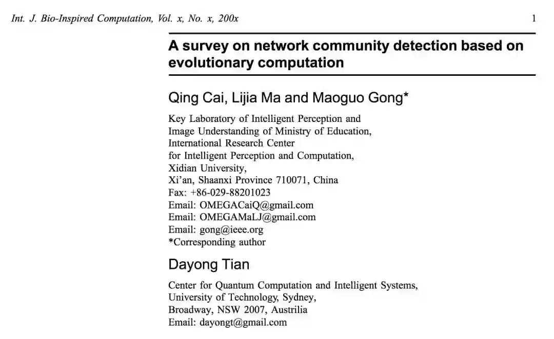 除了以上最新的演化计算在社区发现中应用的综述文献外,稍早一篇发表在 International Journal of Bio-Inspired Computation 上的文章,对这类方法进行了详细综述。