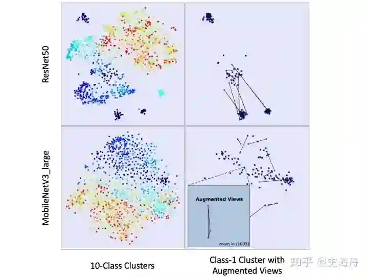 进一步地,我们将模型的表征空间通过t-sne进行可视化,得到图1。观察对比图1的左列,我们发现小模型的表征空间没有形成非常好的簇,绝大多数类别的样本比较松散地聚合在一起,而大模型却形成了一些明显的簇。导致以上分布的原因可以是under clustering(即正样本没有很好地被拉近在一起),同时也可以是over clustering(正样本被过度地拉近,但是同类别的样本没有相应地拉近)。观察图1的右列,我们同时将一个样本和它的两个augmented views' representations连接起来成为一个三角形,可以发现大/小模型的表征空间中的三角形均非常小(需要zoom in 100x才能看清楚),因此也就得到了我们的第三个观察: