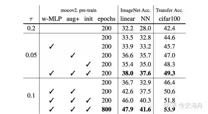 我们可以采用一些看起来fancy的方法来解决over clustering,但我们更希望自己的工作能够给未来的研究做一个铺垫,因此只验证一些看起来合理并且简单的手段,包括:温度( )、负样本数量、数据增广方案、权重初始化质量,以及projector架构。碍于篇幅限制,我们在这里仅仅给出猜想和一些重要的结论,不会涉及其中的实验数据和细节,感兴趣的小伙伴可以看我们的原文~