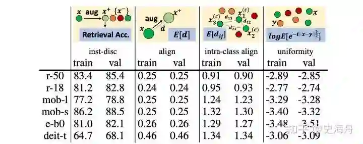 首先我们设置一系列用于评价模型表征空间的评测指标。前置任务相关的评测指标包括alignment、uniformity,以及instance discrimination accuracy. 下游任务相关的评测指标包括intra-class alignment、linear evaluation protocol,以及best-NN。其中intra-class alignment计算的是类内平均距离,使用了标签信息进行评测,它和之前的工作[5]中的tolerance在“单位球面表征空间”的约束下是等价的。而best-NN是我们提出的为了弥补原有的k-NN评测方法缺陷的新的评测指标:不同模型的表征空间可能在不同的超参k情况下能够达到表现的最优值,因此我们遍历 寻找最优的k-NN准确度作为模型的best-NN表现。其余的指标alignment/uniformity/linear evaluation protocol相信大家已经比较熟悉,这里就不再赘述。