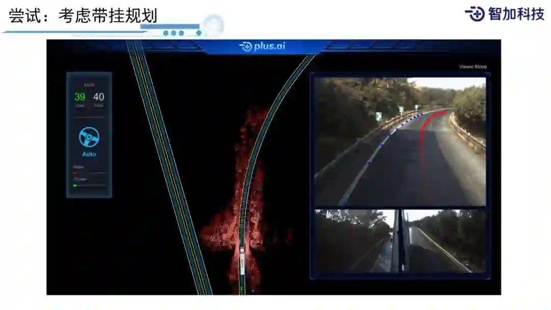这就是我们在上匝道时,可以看到挂车随着匝道有一定的摆动。挂车在匝道上开的时候跟小车开是不太一样的,需要考虑后边的长长的挂载,不能拐弯的时候撞到路肩上,这需要我们做一些带挂的规划。