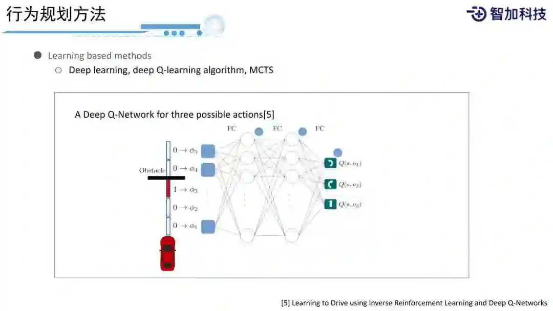 Learning based methods,前面我们的很多专家已经介绍过了,包括Deep Learning、Deep Q-Learning、MCTS这些方法,这里不在详细介绍。这里提一点,Deep Learning的效果非常好,比前面两种方法效果都好,它的问题是Data Collection和Pipeline要求非常高。首先要有足够多的数据,然后整个Pipeline上要有足够完善的工具,包括仿真工具的完善程度,对系统的依赖程度比较高,并不是简单的写几行代码,制定一个规则就可以快速应用的。当然你可以得到一个很初步的版本,但是实际效果Input,背后训练的代价还是很大的。所以需要有很多的车辆配合来获取数据,得到数据的过程和处理数据的过程比写一套代码的工作量还是要大很多的。