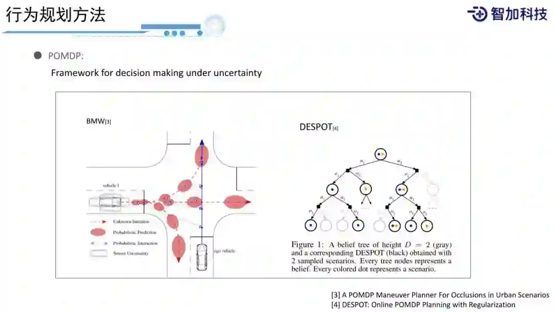 另一个比较常用的方法是POMDP,是一个将uncertainty考虑到decision making过程中的框架。所谓uncertainty,对于有规划经验的人,经常会抱怨,因为我们的上游是感知组,感知可不可以准点,不要有那么多噪音,感知的同学又说到,传感器能不能给准点,大家都有抱怨。但实际情况是,世界肯定是不确定的,所有感知的结果,包括感知的类型、位置,(如左图,可以看到左边的来车,它的位置在这个区域内是服从一定的概率分布的,并不是一个确定的结果,包括它未来的行为,有可能左转、右转或者直行,它的intention和轨迹都是不确定的。我们在规划时,怎样把这种不确定性考虑到规划中?