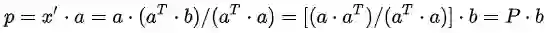 ,其中P是对应的投影矩阵。因此,任意向量b都可以使用P投影到一维子空间a向量的方向上,换言之,对P列空间的基作任意线性组合均落在子空间a中,即P列空间撑满了子空间a,因此P的列空间和秩都与投影子空间a相同,即过a的一条直线,秩为1。另外,投影矩阵必须满足2个性质: