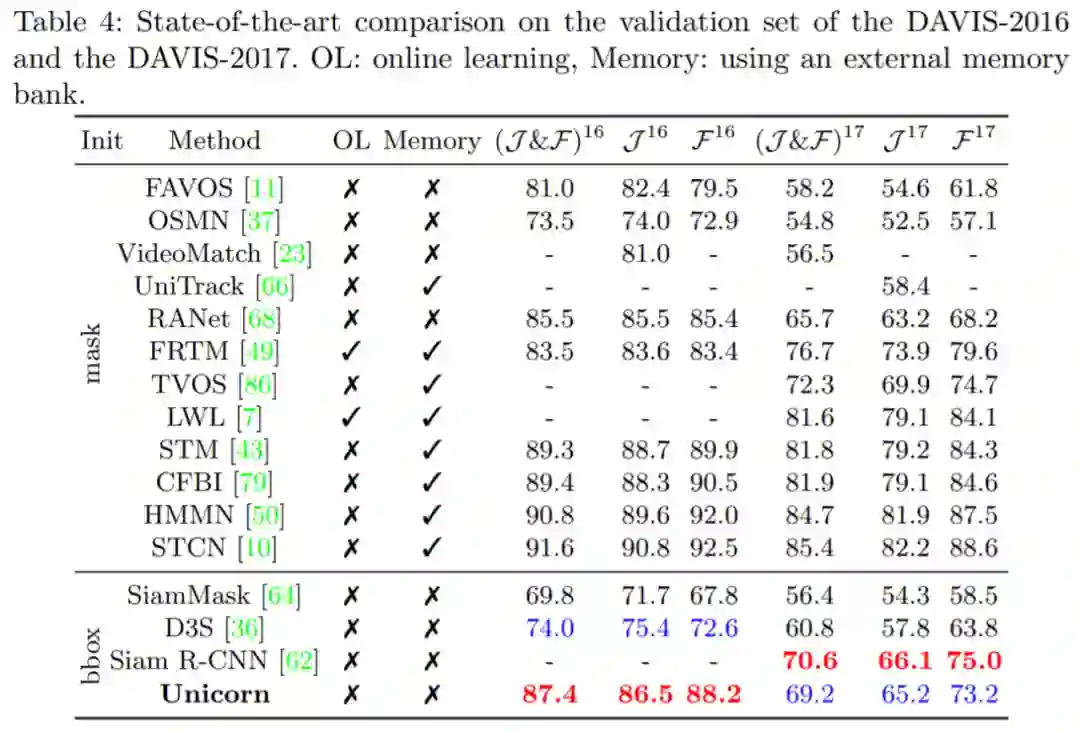 DAVIS-16 在验证集中包含 20 个视频,每个序列中只有一个跟踪目标。图 4 表明 Unicorn 在使用边框初始化的方法中取得了最好的结果,甚至超过了使用掩码初始化的 RANet 和 FRTM。