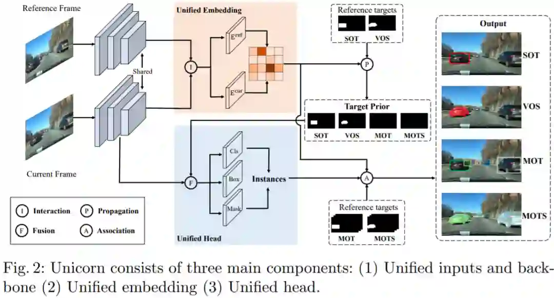Unicorn 由三个部分组成:统一输入与主干、统一嵌入、统一头。三个组件分别负责获得强大的视觉表征、建立精确的对应关系和检测不同的跟踪目标。Unicorn 的框架如图 2 所示。给定参考帧 I_ref、当前帧 I_cur 和参考目标,Unicorn 旨在通过统一的网络预测当前帧上跟踪目标的状态,以用于四个任务。