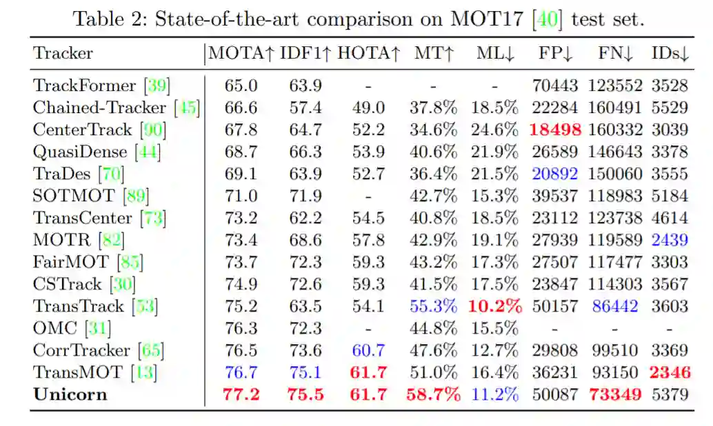 MOT17 以行人跟踪为重点,训练集有 7 个序列,测试集也有 7 个序列。从表 2 可以看出,Unicorn 实现了最好的 MOTA 和 IDF1,分别比之前的 SOTA 方法高出 0.5% 和 0.4%。