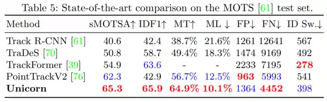MOTS20 Challenge 在训练集中有 4 个序列,在测试集中有 4 个序列。如表 5 所示,Unicorn 实现了 SOAT 性能,在 sMOTSA 上以 3.3% 的幅度超过了第二好的方法 PoinTrackV2。