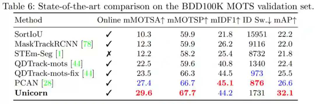 BDD100K MOTS Challenge 在验证集中包含 37 个序列。图 6 表明 Unicorn 大大优于先前最佳方法 PCAN(即 mMOTSA +2.2%,mAP +5.5%)。同时,Unicorn 没有像 PCAN 那样使用时空存储器或原型网络等复杂设计,引入了更简单的 pipeline。