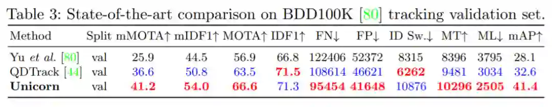 BDD100K 是一个大规模的视觉驾驶场景数据集,需要跟踪 8 类实例。如表 3 所示,Unicorn 取得了最佳性能,在验证集上大大超过了之前的 SOTA 方法 QDTrack。具体来说,mMOTA 和 mIDF1 的提升分别高达 4.6% 和 3.2%。