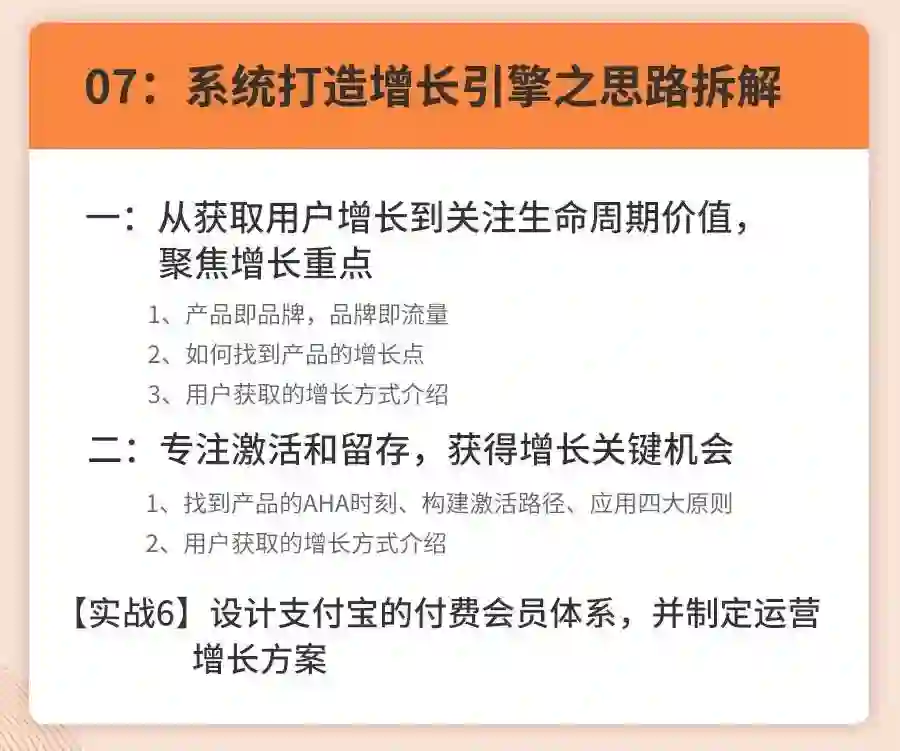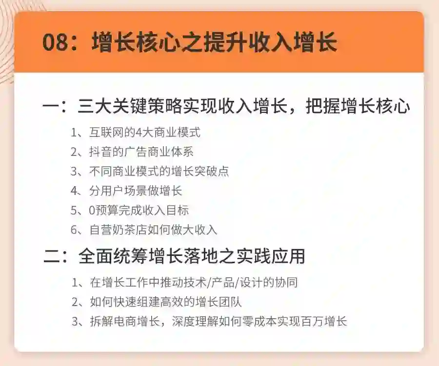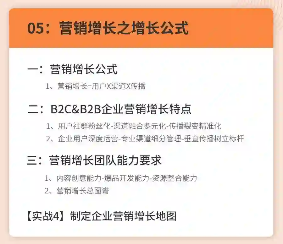 课程内容侧重给大家搭建营销增长四个模块的思维框架,配合案例拆解+实战演练的形式,老师线下深度沟通去辅助理解整个知识框架和落地思路。