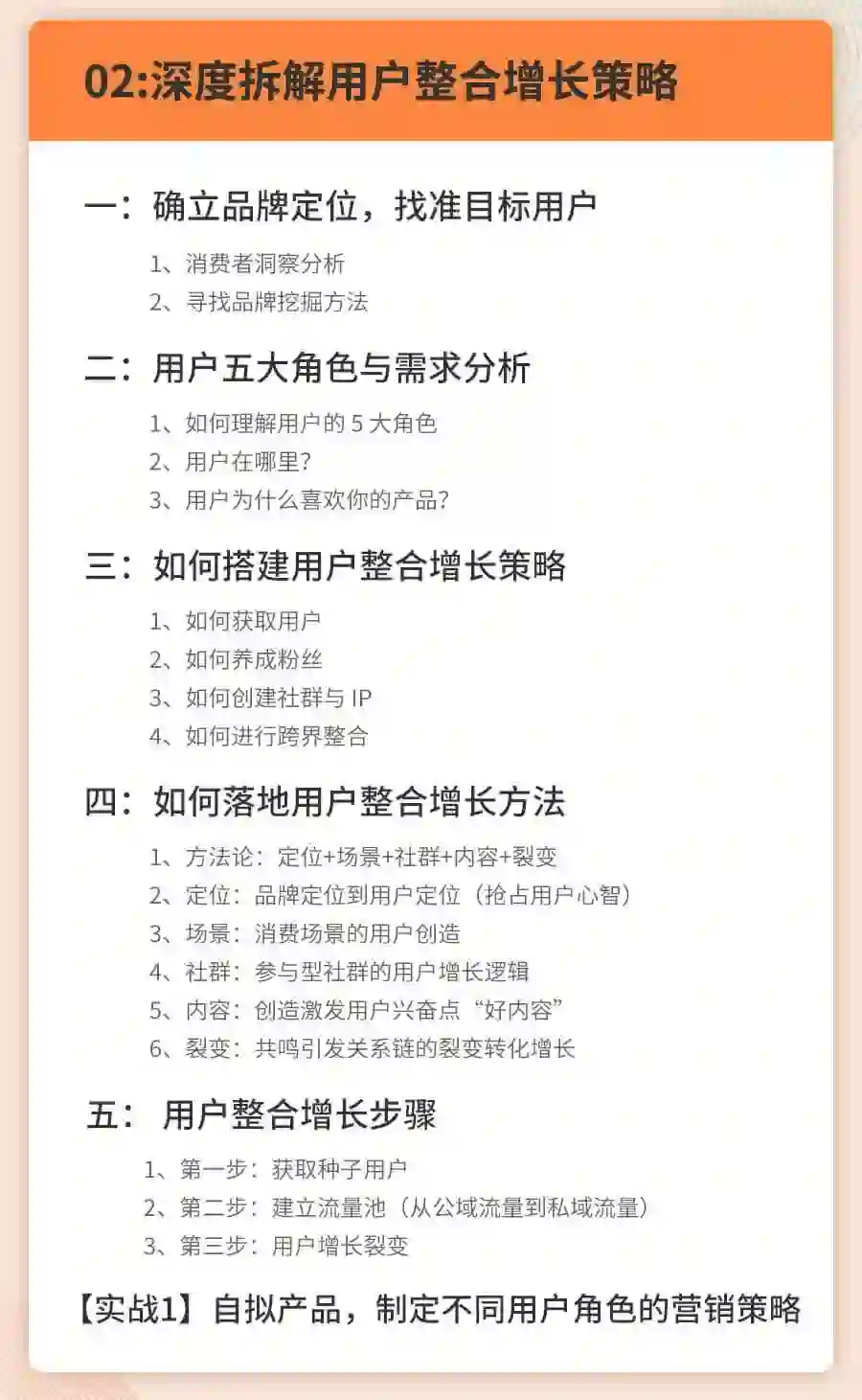 从用户整合、渠道整合、传播整合、用户增长四大维度全方位地讲解了互联网人如何提升营销增长能力,既有底层逻辑的框架讲解,也有导师自己实战案例的解析。