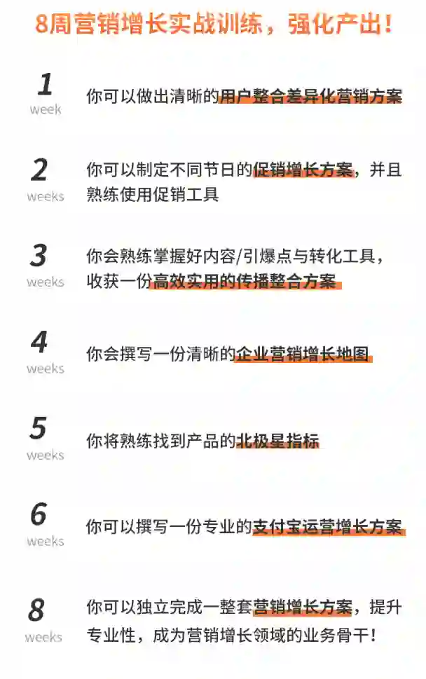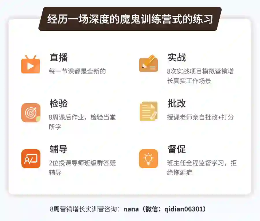 为此,这里推荐由起点学院联合美图秀秀运营副总裁@陈辉老师、《极限挑战3》宣传顾问@魏家东老师,共同打磨迭代的线上【8周营销增长实训营】
