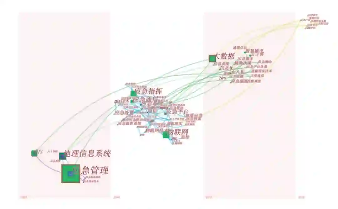 在关键词共现图谱中,某一关键词出现频次越高,其节点及相应字体越大。节点之间的连线表示关键词的共现关系,连线粗细表明共现强度,连线越粗强度越大。从紫色至黄色的色调变化,表示时间从早期向近期推移。应急科技相关文献的关键词共现聚类图谱显示,地理信息系统、信息技术、应急通信技术、物联网、虚拟现实技术、卫星及遥感应用、智慧应急、大数据技术等出现频次较高,且与其他关键词之间的联系程度较强,是科技与应急管理相结合的研究重点和热点,也说明了这些科技在应急管理中的应用比较广泛,受到较高的关注(图1)。关键词共现时区图谱从时间跨度上表明知识的演进过程。在 2003~2007 年,“地理信息系统”这一关键词最为突出,是该阶段在应急科技领域的研究重点(图 2)。2003年“非典事件”后,中国政府加强了应急预案与灾害预警工作,地理信息系统也为应急规划与准备提供了有力支撑。在此阶段还包括人工智能、信息集成技术等科技。在 2008~2012年,应急科技发展迅速,科技类型与应用领域都表现出多样化,“物联网”“应急通信”“应急平台”“应急指挥系统”“虚拟现实”等成为了研究焦点。在此阶段中,南方雪灾、汶川地震、玉树地震等重大突发事件极大地推动了中国应急管理的进一步快速发展,研究工作扩散至应急通信、应急指挥、应急救援等众多领域,应急管理模式也从单一主体应对模式向多元主体协同模式转变,充分体现了应急管理向系统性、创新性、全面性方向迈进。2013~2017年,“无人机”“大数据”“智慧城市”“云计算”“虚拟现实”等研究领域逐渐成为研究热点,不断丰富了应急管理科技支撑体系,加快了应急产业的发展,促进了应急生态的形成。