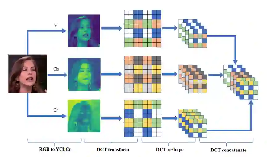 受到文献[2][3]的启发,本文提出了一种完全由数据驱动的自适应频域特征生成模块。如图二所示,AFFGM由数据预处理和自适应频域信息挖掘模块AFIMB(Adaptive frequency information mining block)组成。数据预处理的流程如图三所示。前两步类似jpeg压缩,将空间域图像变换到YCbCr空间,并在每个图像块上作DCT变换。DCT变换后所有图像块中同一频段的系数按照原图像块的位置组合成一个通道。最后把所有的通道组合在一起,正则化后作为AFIMB的输入。
