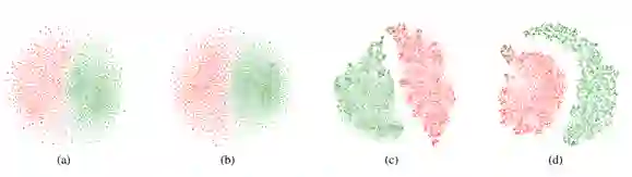 图四:不同损失函数监督下特征的可视化。(a)softmax loss(b) triplet + softmaxloss(c)center + softmax loss(d)SCL + softmax loss。