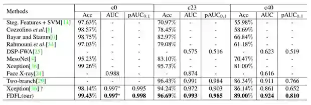 该研究在FF++数据集上与之前的人脸伪造检测方法进行了比较。结果如下表所示: