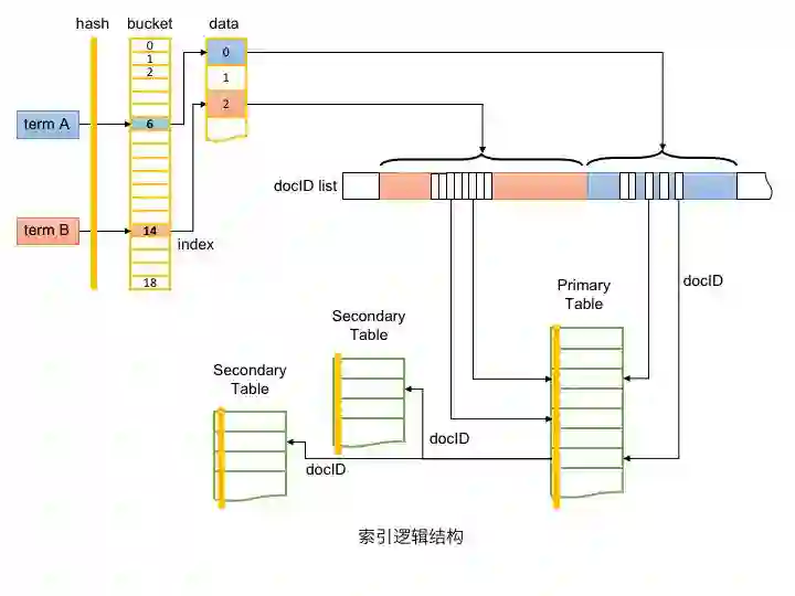 从功能角度,索引由Table和Index两部分组成。如上图所示,Index实现由Term到主表docID的转换;Table实现正排数据的存储,并通过docID实现主表与辅表的关联。